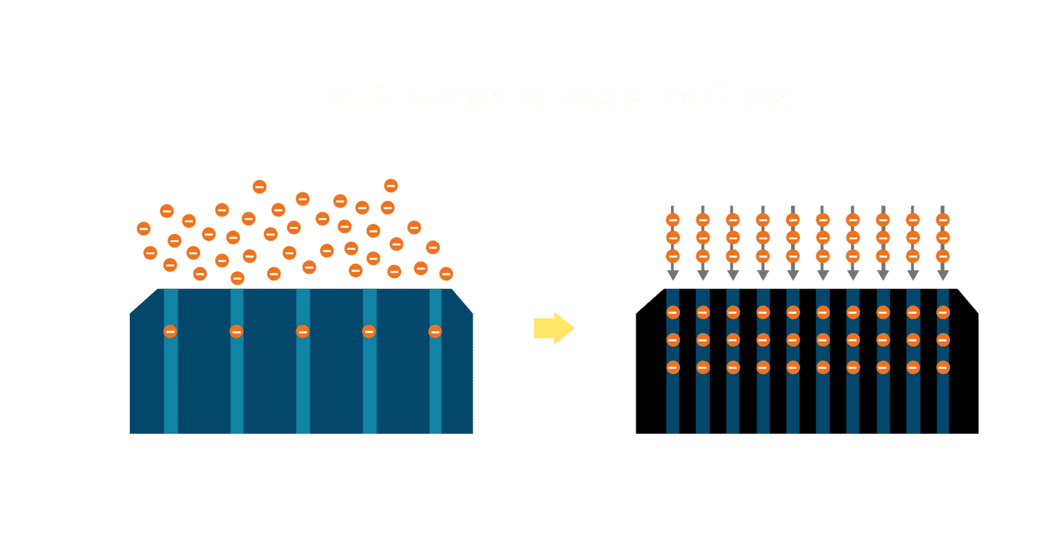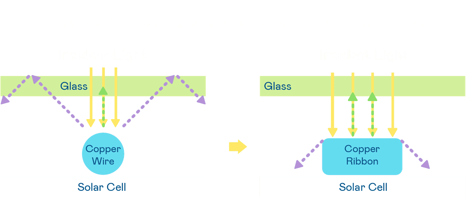 - 电池使用多条铜导线 (Copper wire) 于电池片上形成较短的电流路径,,,提高电流收集效率,,采用圆形设计的铜导线较传统扁平式的铜焊带 (Ribbon),,,,可增加入射至电池的光线量。。。
