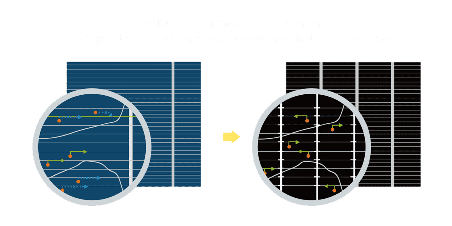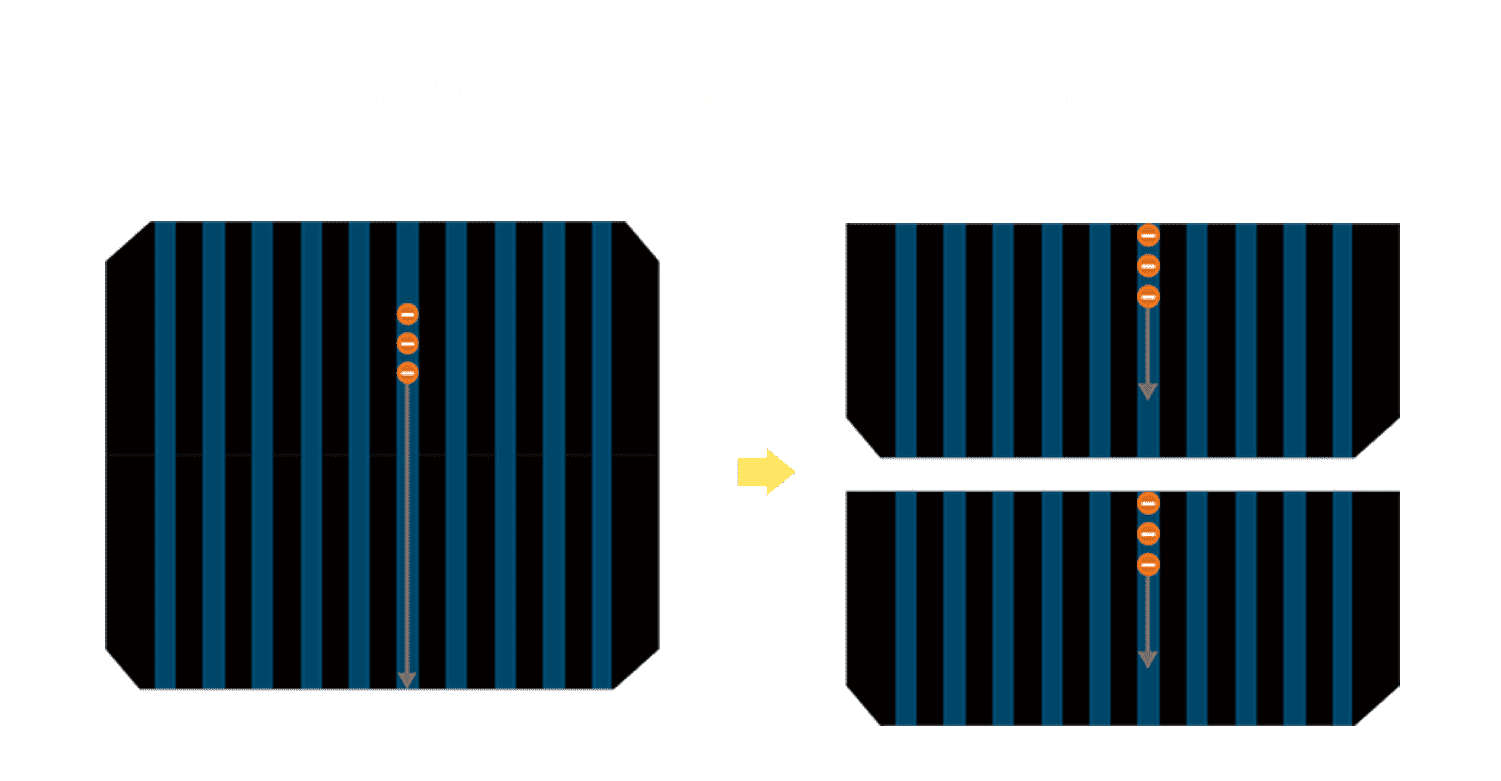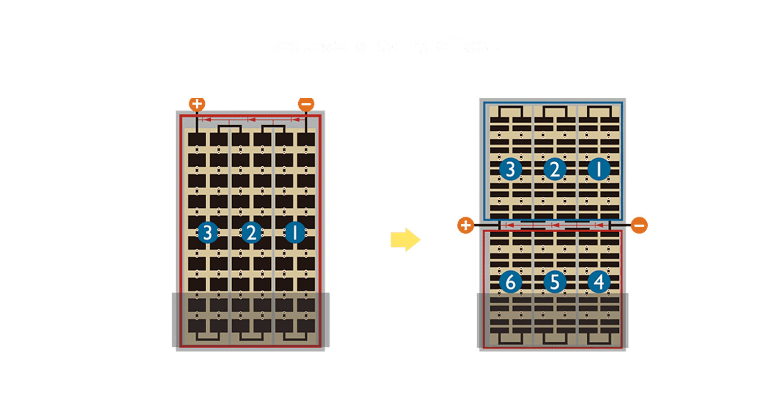 - 结合半切电池,,,降低遮阴影响、、提升模组抗隐裂能力、、、并减少电阻损耗,,,,进一步提升模组发电效能。。。。